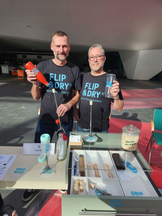 Ein Ärgernis ging auch der Erfindung von Alex Thommen und André Lüthi voraus. Fast jeder hat Trinkflaschen zu Hause – für den Sport oder für die Kinderschultasche. Hat man eine Trinkflasche gespült, stellt sich die Frage: Wie trocknen? Stellt man sie einfach offen hin, bleibt das Restwasser lange in der Flasche. Stellt man sie „kopfüber“ auf die Trinköffnung, können die Tropfen auch nicht abfließen oder verdunsten. Lehnt man die Flasche an die Wand, um einen Luftspalt zu lassen, fällt sie leicht um. Und egal wie man es macht, oft bleibt ein etwas modriger Geruch in der Flasche zurück.
