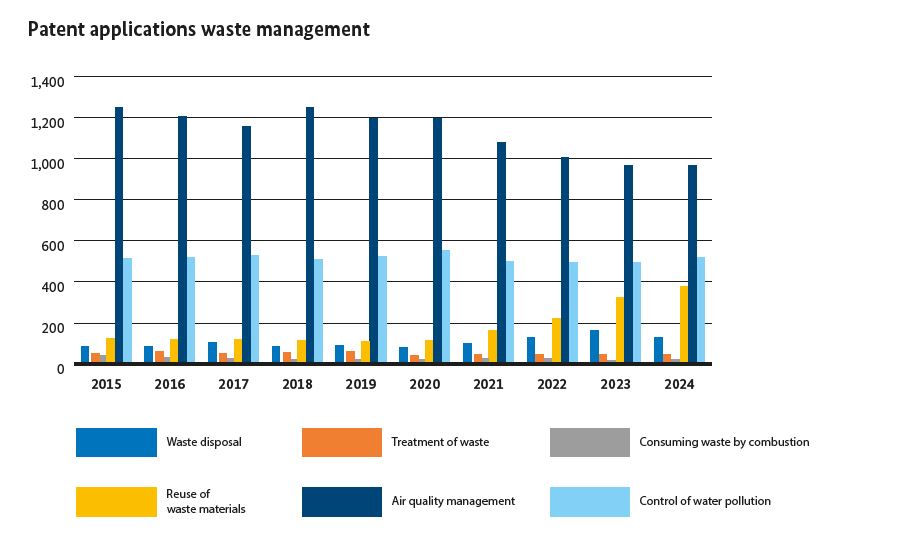 Munich. The development of innovations in recycling has gained significant momentum in recent years. In 2024, 379 patent applications for the recycling of valuable materials from waste were published for the German market – three times as many as ten years ago. Publications by German applicants also increased significantly during this period. There was also a marked increase in applications in the field of waste disposal. By contrast, the number of inventions relating to air pollution control declined overall. One important reason for this appears to be the decline in innovation activity for combustion engines. In this context, inventions relating to exhaust gas treatment are also declining significantly. These are the findings of an analysis by the German Patent and Trade Mark Office (DPMA) on technologies for waste management and the circular economy.