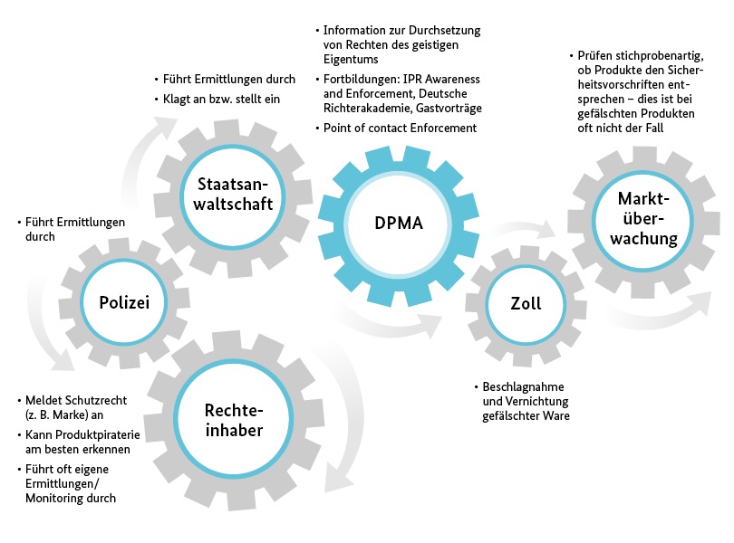 - Deutsches Patent- und Markenamt (DPMA): Trägt gewerbliche Schutzrechte ein. Information zu geistigen Eigentumsrechten und ihrer Durchsetzung. Zum Beispiel bei der IPR Awareness and Enforcement Fachtagung, bei der Deutschen Richterakademie oder bei Gastvorträgen. Das DPMA ist auch "Enforcement Point of Contact".