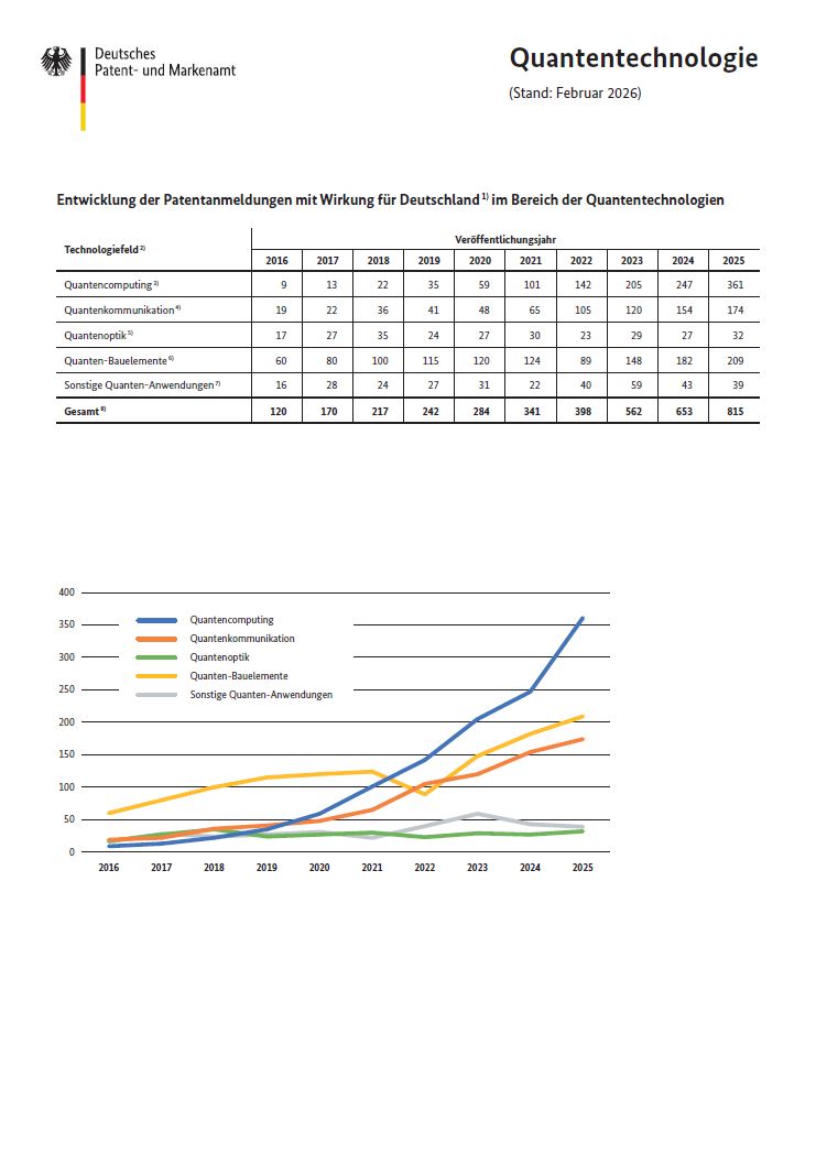 München. Die Quantentechnologie gilt als kommende Schlüsseltechnologie mit ähnlich großem Veränderungspotenzial wie Künstliche Intelligenz – und die Innovationstätigkeit auf diesem Gebiet nimmt erheblich an Fahrt auf: In den vergangenen zehn Jahren hat sich die Zahl der Patentanmeldungen mit quantentechnologischem Bezug für den deutschen Markt nahezu versiebenfacht. Ein großer Teil davon kommt von Firmen und Forschungseinrichtungen aus Deutschland. Das geht aus einer Analyse hervor, die das Deutsche Patent- und Markenamt (DPMA) anlässlich des diesjährigen DPMAnutzerforums durchgeführt hat. Zur größten jährlichen Veranstaltung des Amts am 17. und 18. März kommen wieder Expertinnen und Experten zum gewerblichen Rechtsschutz aus der Industrie, von Anwaltskanzleien und Dienstleistern sowie aus der Wissenschaft und vom Bundesministerium der Justiz und für Verbraucherschutz (BMJV) in München zusammen. Das Potenzial von Quantentechnologien für Deutschland und die zentrale Bedeutung des Innovationsschutzes in diesem Zusammenhang stehen im Fokus der Veranstaltung. Auf dem